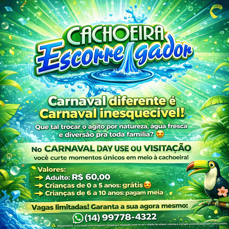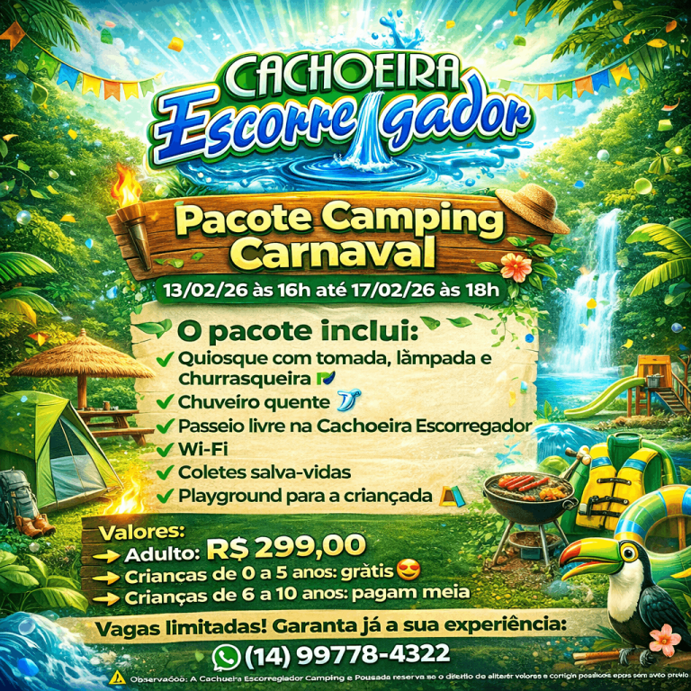 O Camping Escorregador em Brotas, SP, é uma das melhores opções para quem deseja acampar perto da natureza, ao lado da famosa Cachoeira Escorregador. Ideal para ecoturismo, trilhas e aventuras ao ar livre, o camping oferece uma experiência única para famílias, amigos e aventureiros. Brotas é conhecida por suas cachoeiras e roteiros de ecoturismo, e o Camping Escorregador proporciona acesso fácil à Cachoeira Escorregador, uma das mais belas da região. Se você está procurando um lugar para acampar em São Paulo, não perca a chance de visitar o Camping Escorregador, com natureza exuberante, trilhas emocionantes e infraestrutura para camping.