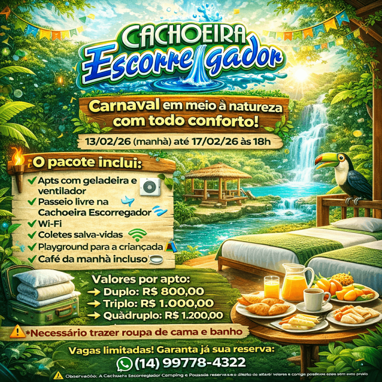 Bem-vindo ao paraíso natural de Brotas, SP! Descubra a Cachoeira Escorregador, uma maravilha natural que combina a beleza da natureza com aventuras emocionantes. Oferecemos a experiência única de camping e aconchego na nossa pousada. Sinta a adrenalina na tirolesa e entregue-se à serenidade da cachoeira. Seja parte desta experiência inigualável em uma das mais belas de Brotas.