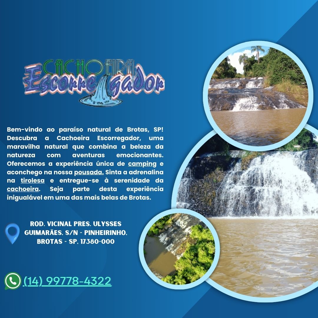 O Camping Escorregador em Brotas, SP, é uma das melhores opções para quem deseja acampar perto da natureza, ao lado da famosa Cachoeira Escorregador. Ideal para ecoturismo, trilhas e aventuras ao ar livre, o camping oferece uma experiência única para famílias, amigos e aventureiros. Brotas é conhecida por suas cachoeiras e roteiros de ecoturismo, e o Camping Escorregador proporciona acesso fácil à Cachoeira Escorregador, uma das mais belas da região. Se você está procurando um lugar para acampar em São Paulo, não perca a chance de visitar o Camping Escorregador, com natureza exuberante, trilhas emocionantes e infraestrutura para camping.